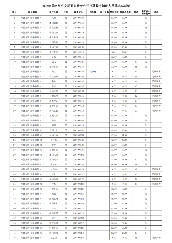 附件:2022年果洛州公安局面向社会公开招聘警务辅助人员笔试总成绩